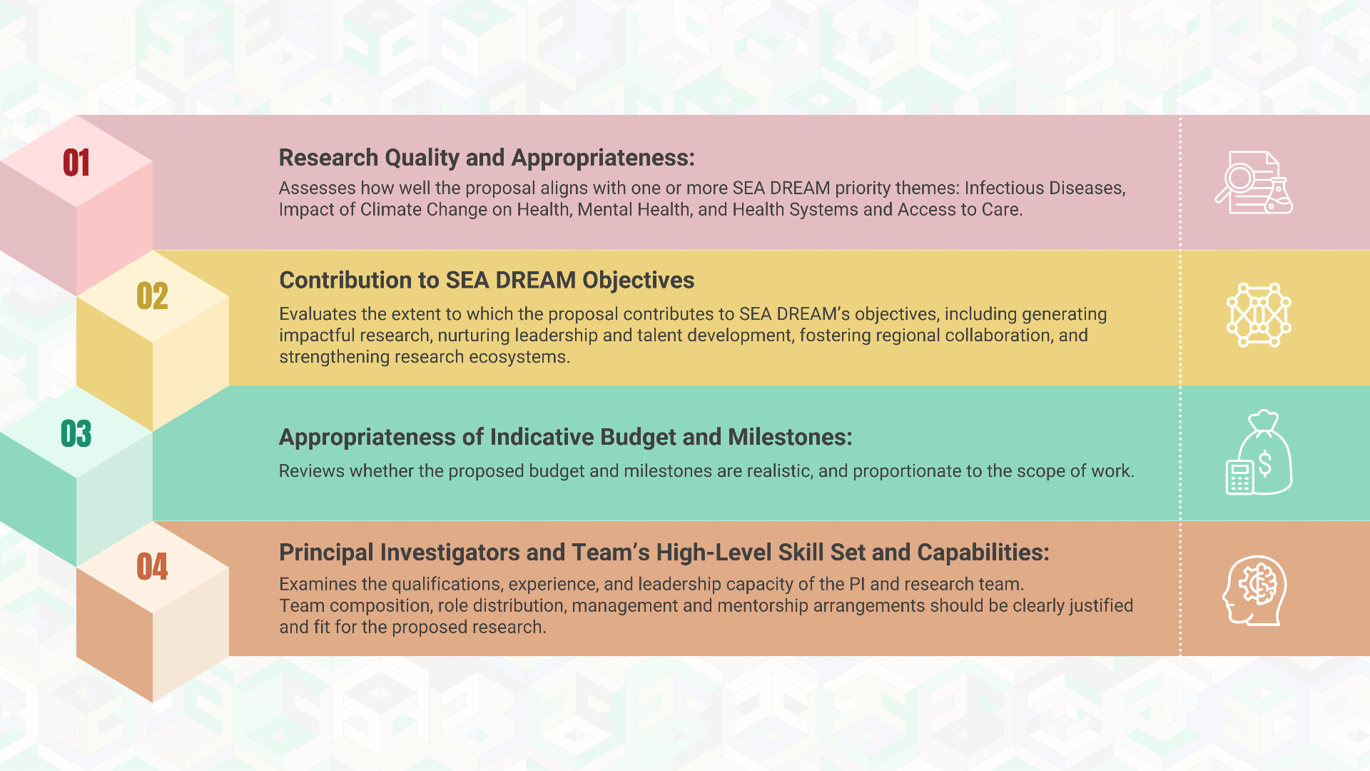 SEA DREAM uses these preliminary assessment questions to support a fair and consistent initial review of submitted applications. The questions are structured around four categories: research quality and appropriateness, contribution to SEA DREAM objectives, appropriateness of indicative budget and milestones, and the Principal Investigators and team’s high-level skill set and capabilities.